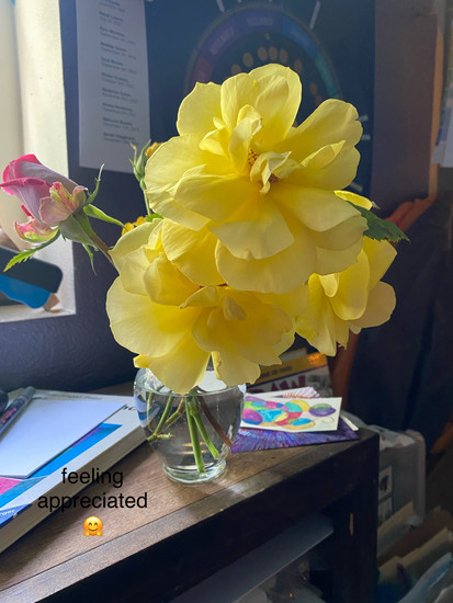 My rose today: Opal manifested a drum circle at the beginning of circle, and it's always so nice when everyone gets inspired and joins in. In no time everyone had a drum (or three), with minimal squabbling. We drummed together, following Opal as the leader as she changed the volume and tempo. I had to join in with the saxophone, and then I put on some African drumming (I do love my Alexa!) for us to play with, and soon everyone was dancing.